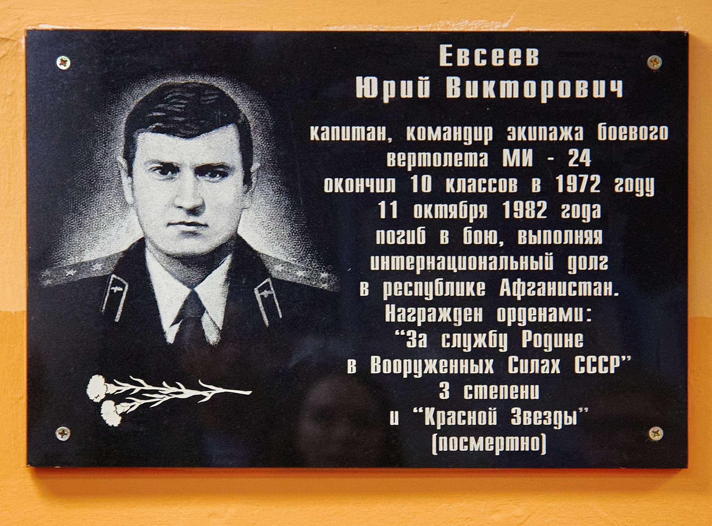В нашей школе установлена памятная мемориальная доска Евсееву Юрию Викторовичу, нашему выпускнику, погибшему в Афганистане. 13 февраля в школе прошла линейка, в память о воинах-интернационалистах.