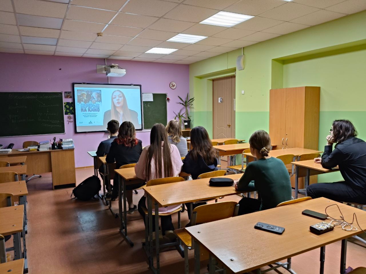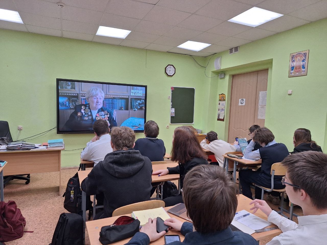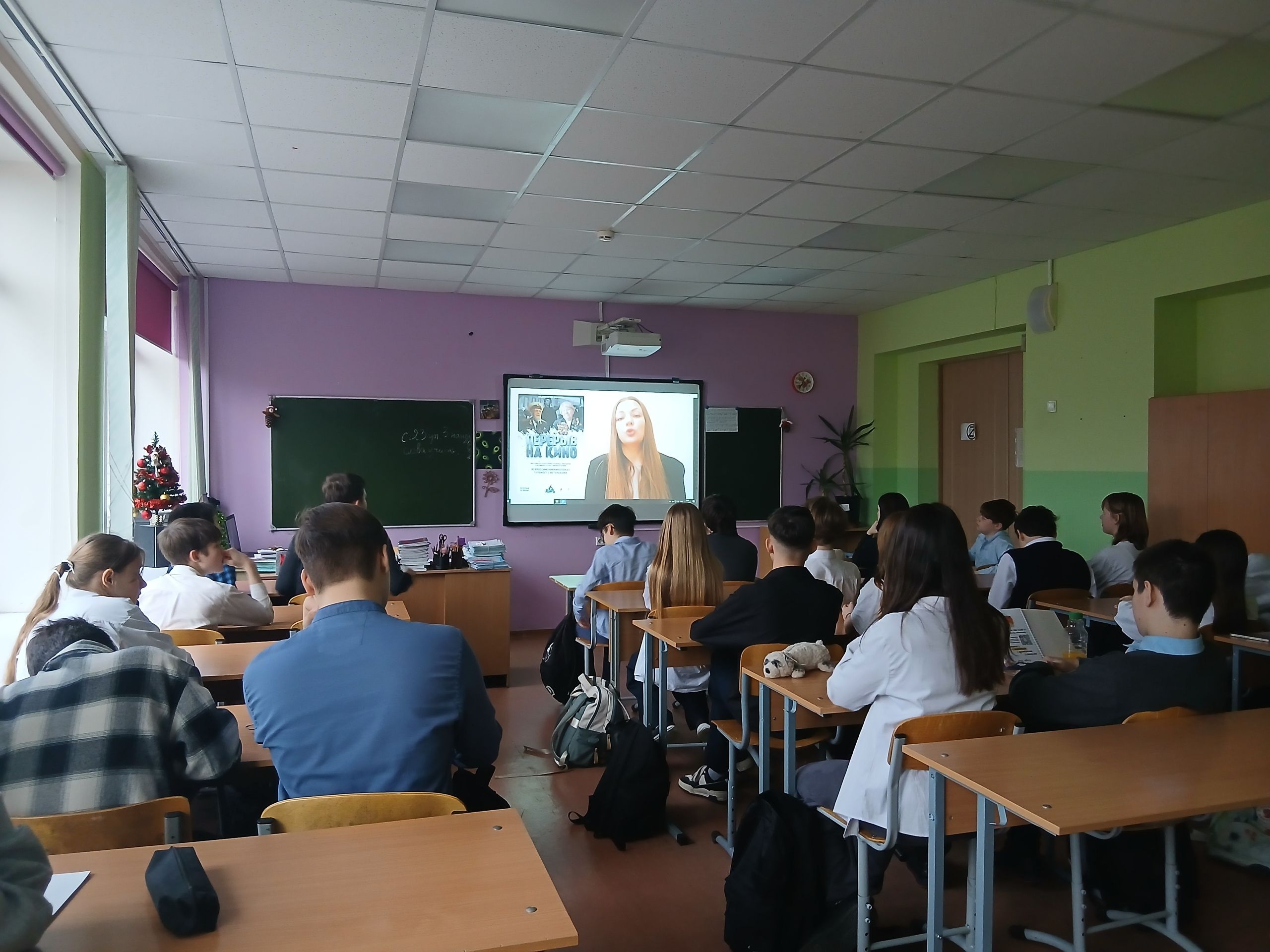 Ученики посмотрели 45-минутную программу из четырёх кинокартин, среди которых мультфильм «Мой прадед - мой герой», музыкальная работа «А может не было войны», а также две документальные ленты кинопроизводства «Перерыв на фильм» - «Творец своей судьбы» и «Партизанка Тася» о ветеранах Великой Отечественной войны - Загумённовом Николае Павловиче и Таисии Михайловне Козырь-Павловской.